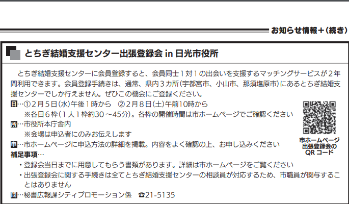 NEWSセンターからのお知らせ センターからのお知らせ一覧に戻る ☆出張登録会☆(日光市) 2020年1月13日 「とちぎ結婚支援センター出張登録会in日光市役所」が2月に開催されます。 詳細は日光市広報1月号(№178)をご確認ください。 (広報誌は日光市役所ホームページにも掲載されています。https://www.city.nikko.lg.jp/hisho/gyousei/kouhou/19/01.html ) 日光市在住の皆様、この機会に是非ご利用ください。 新しい記事へ古い記事へ