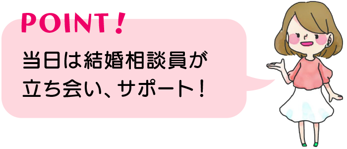 システムを利用し、お二人でお引き合わせの日時・場所(センター)を決めていただきます。結婚相談員はお引き合わせに同席してお二人をサポートします。(オンラインでのお引き合わせも実施しています)